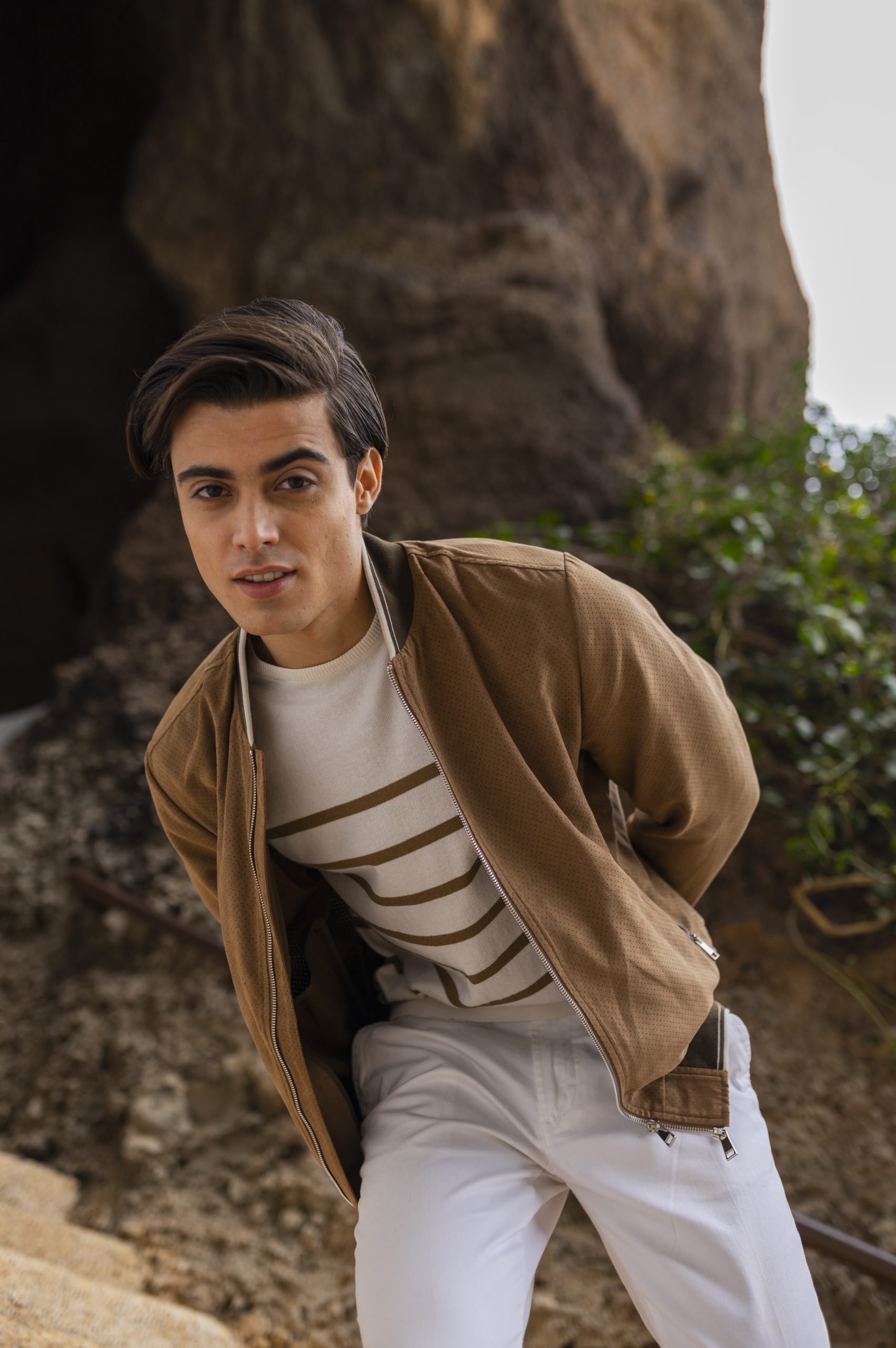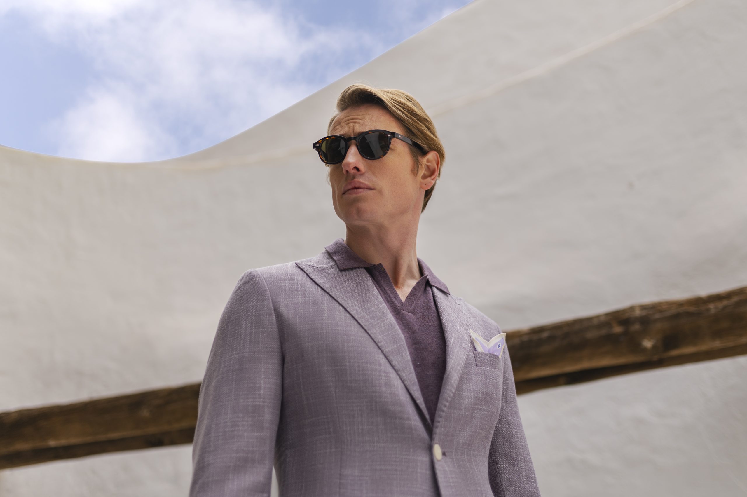 Palette terrose si mescolano a nuance che ricordano il cielo. Ci sono completi Terra bruciata con la polo in piquet di cotone gialla, blazer e pantaloni di lino con la coulisse testa di moro, giubbini biscotto, tailleur beige, ma anche celesti, lilla e bianchi. La spensieratezza della vita en plein air si traduce in maglie mariniére, blu navy o elettrico.