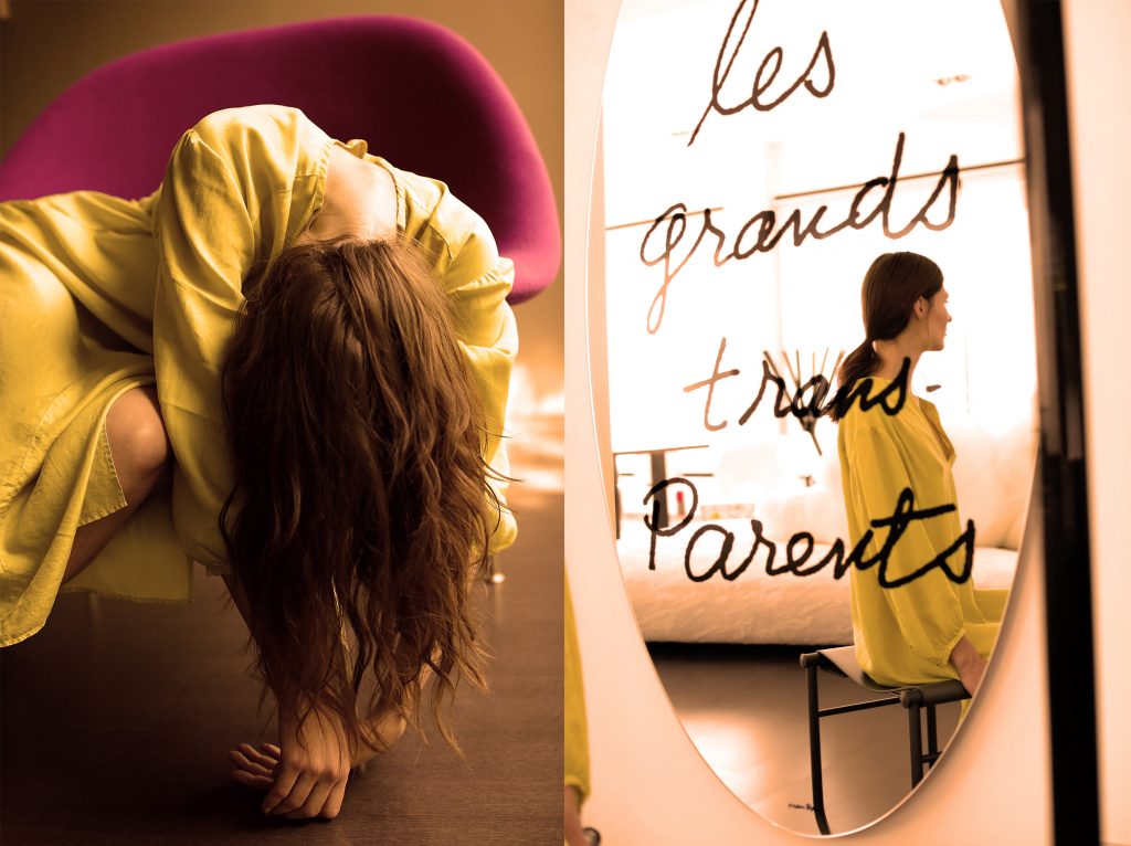 chemisier verde acido Pomandère, poltrona fucsia Womb di Knoll design Eero Saarinen – dx specchio Cassina Les Grands Trans-parents, omaggio a Man Ray