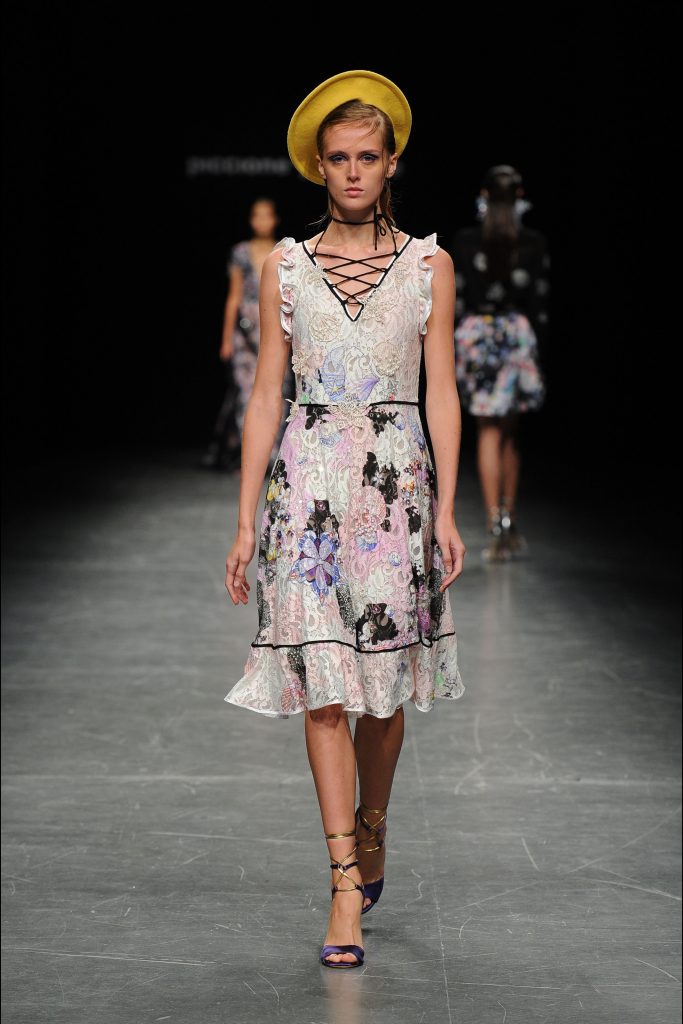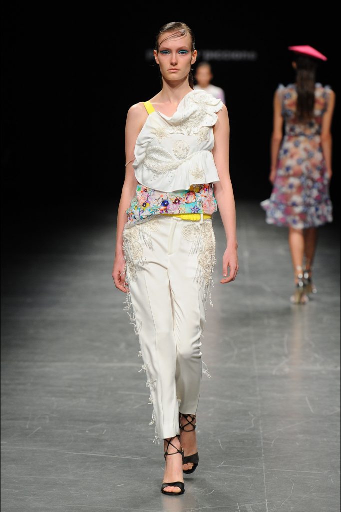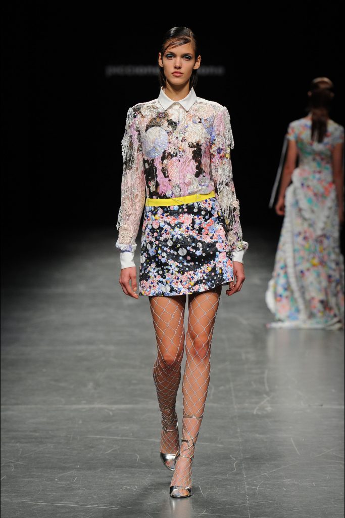 Piccione.Piccione sfila alla Milano Fashion Week un mondo incantato, immagini di una realtà illusoria, fiabesca e brillante. Pizzi, sangalli, ricami, ogni scelta materica è di una delicatezza esasperata e minuziosamente lavorata per stupire, ogni dettaglio femminile conferisce alla totalità dell’outfit una contemporaneità originale.